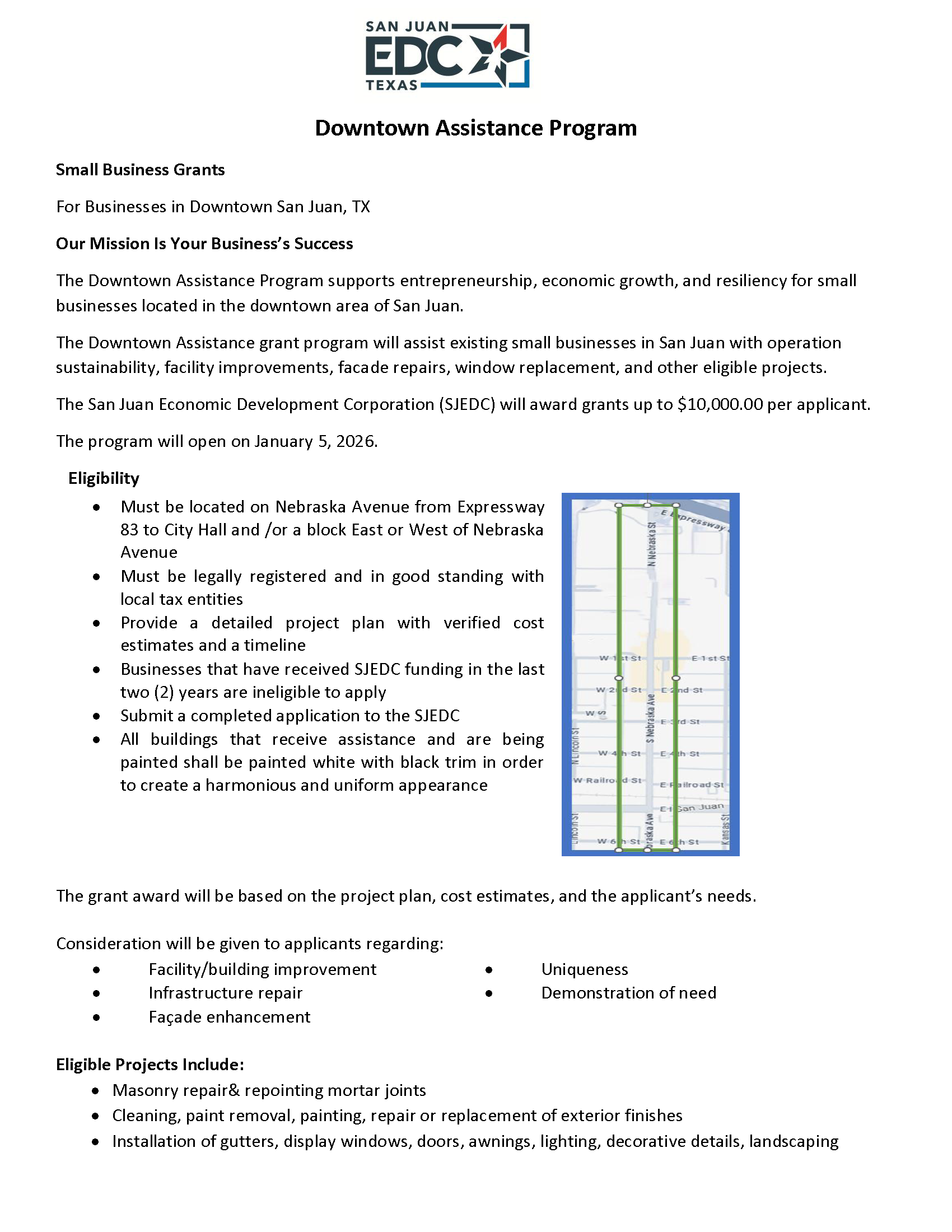 The Downtown Assistance grant program will assist existing small businesses in San Juan with operation sustainability, facility improvements, facade repairs, window replacement, and other eligible projects.
